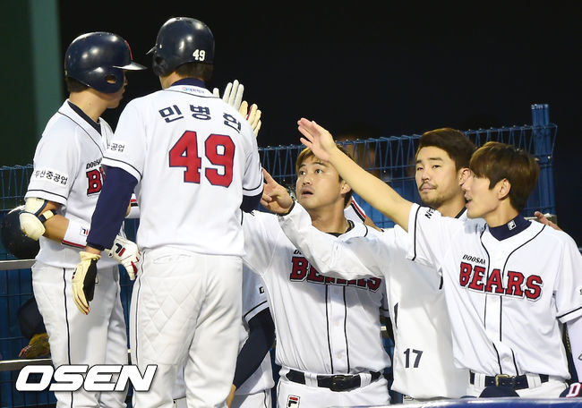 1회말 무사 3루 정수빈 중견수 희생플라이 아웃때 홈을 밟은 3루주자 민병헌이 덕아웃에서 동료들과 하이파이브를 나누고 있다.