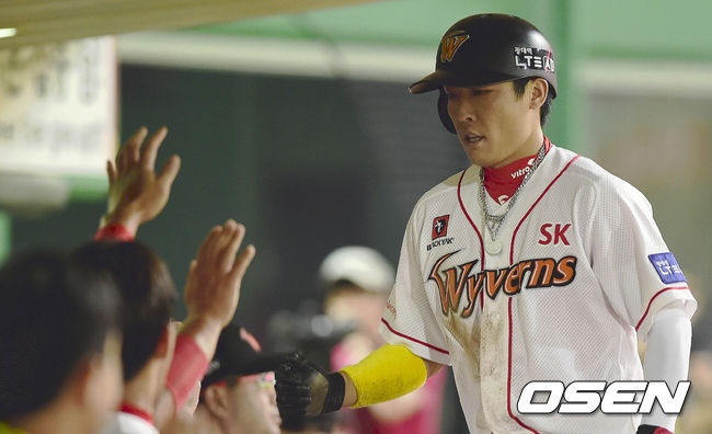 12일 오후 인천 문학구장에서 열린 '2014 한국야쿠르트 세븐 프로야구 SK 와이번스와 넥센 히어로즈의 경기, SK 치어리더가 멋진 응원을 선사하고 있다. 3회말 1사 주자 1루, SK 최정의 1타점 2루타로 홈을 밟은 조동화가 기쁨을 나누고 있다.