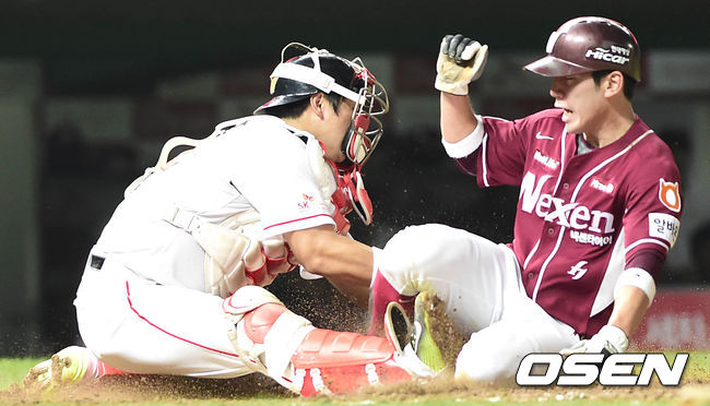 12일 오후 인천 문학구장에서 열린 '2014 한국야쿠르트 세븐 프로야구 SK 와이번스와 넥센 히어로즈의 경기, 4회초 무사 주자 3루, 넥센 박병호의 외야 플라이에 홈쇄도를 시도하던 서건창이 아웃당하고 있다.