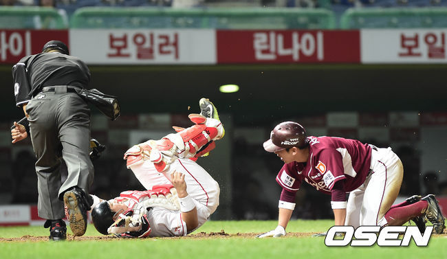 12일 오후 인천 문학구장에서 열린 '2014 한국야쿠르트 세븐 프로야구 SK 와이번스와 넥센 히어로즈의 경기,  4회초 무사 주자 3루 넥센 박병호의 외야 플라이에 홈쇄도를 시도하던 서건창이 아웃당하고 있다.