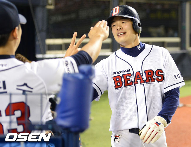 4회말 2사 1루 정수빈 1타점 3루타때 홈을 밟은 민병헌이 덕아웃에서 동료들과 하이파이브를 하고 있다.