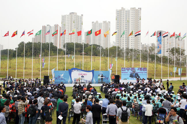 제17회 인천아시아경기대회에 참가하는 45개국 1만 4500여명의 선수단이 머물 선수촌이 공식 개촌했다.