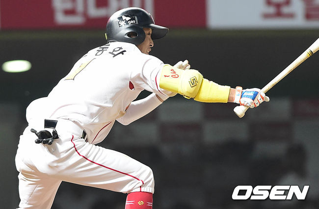 12일 오후 인천 문학구장에서 열린 '2014 한국야쿠르트 세븐 프로야구 SK 와이번스와 넥센 히어로즈의 경기, 6회말 2사 SK 조동화가 데뷔 첫 100안타를 치고 있다.