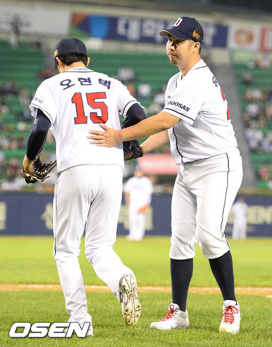 8회초 1사 1루 상황에서 유희관이 마운드를 내려오면서 오현택을 격려하고 있다.