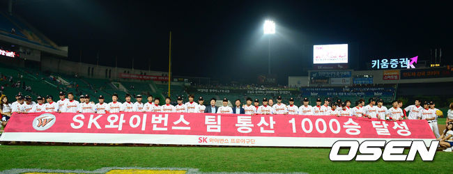 경기종료후 SK 선수들이 1000승 기념촬영을 하고 있다. /greenfield@osen.co.kr