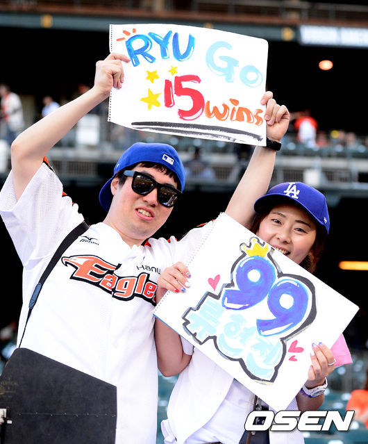 13일(이하 한국시간) 미국 캘리포니아주 샌프란시스코 AT & T 파크에서 열린 '2014 메이저리그' LA 다저스와 샌프란시스코 자이언츠의 경기, 경기에 앞서 류현진이 팬이 피켓을 들고 열띤 응원을 하고 있다.