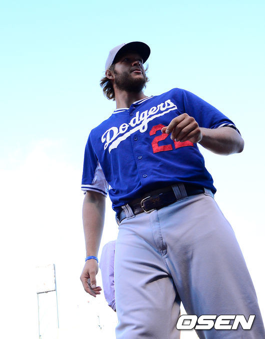 13일(이하 한국시간) 미국 캘리포니아주 샌프란시스코 AT & T 파크에서 열린 '2014 메이저리그' LA 다저스와 샌프란시스코 자이언츠의 경기, 경기에 앞서 다저스 커쇼가 훈련을 마치고 더그아웃으로 향하고 있다.