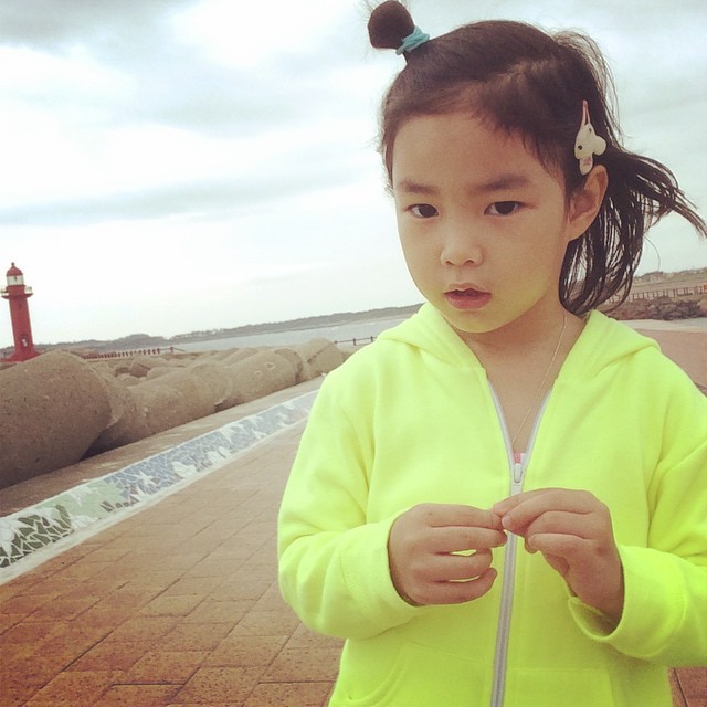 사진 속 이하루는 바닷가를 배경으로 귀여운 사과 머리와 형광색의 후드집업을 입고 카메라를 응시하고 있다.
