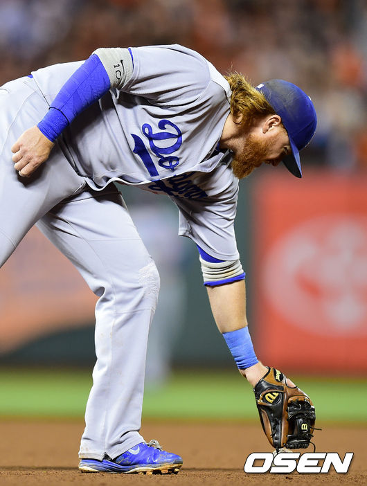 13일(이하 한국시간) 미국 캘리포니아주 샌프란시스코 AT & T 파크에서 열린 '2014 메이저리그' LA 다저스와 샌프란시스코 자이언츠의 경기, 4회말 2사에서 다저스 터너가 샌프란시스코 펜스의 타구를 놓치며 아쉬워하고 있다.