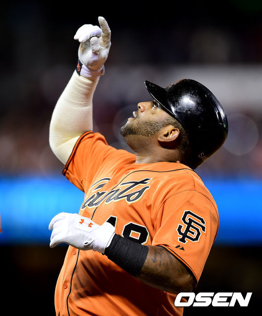 13일(이하 한국시간) 미국 캘리포니아주 샌프란시스코 AT & T 파크에서 열린 '2014 메이저리그' LA 다저스와 샌프란시스코 자이언츠의 경기, 3회말 무사에서 샌프란시스코 산도발이 중전 안타를 날리고 기뻐하고 있다.