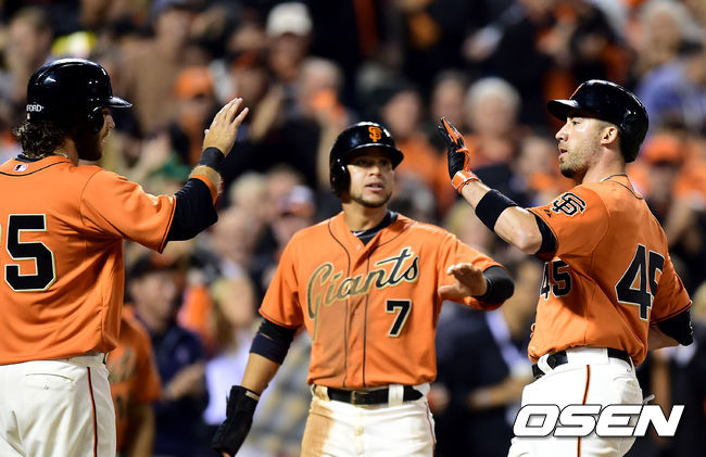 13일(이하 한국시간) 미국 캘리포니아주 샌프란시스코 AT & T 파크에서 열린 '2014 메이저리그' LA 다저스와 샌프란시스코 자이언츠의 경기, 7회말 2사 1,2루에서 샌프란시스코 이시카와가 스리런포를 날리고 기뻐하고 있다.