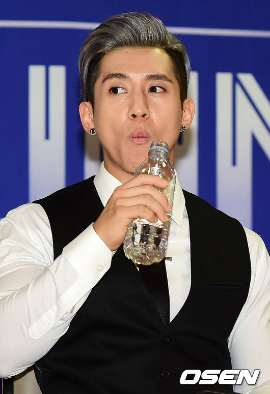 플라이투더스카이 브라이언이 13일 오후 서울 경희대학교 평화의전당에서 열린 앵콜 콘서트 기자간담회에서 음료를 마시고 있다.