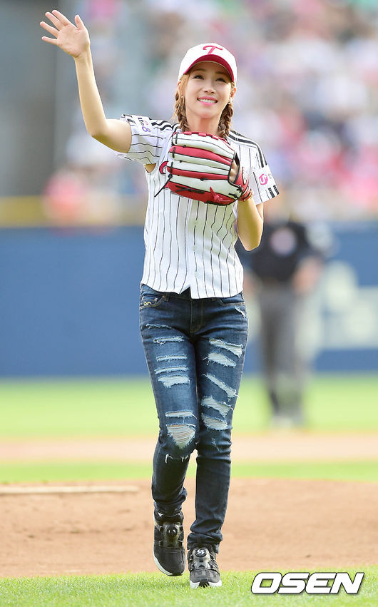 배우 이유리가 시구자로 나서 팬들에게 인사하고 있다.