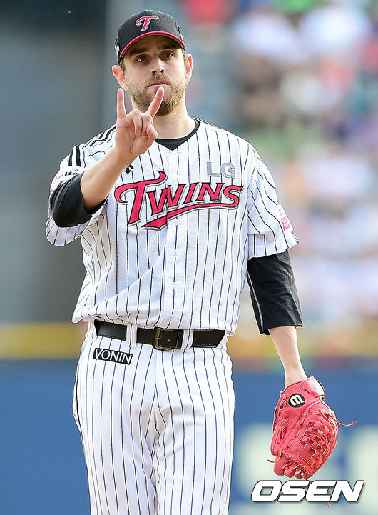 LG 선발 리오단이 연습 투구 중 포수에게 사인을 보내고 있다.