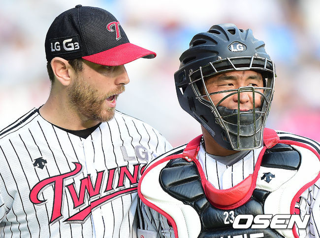 1회초 삼성 공격 2사 1루 상황 최형우의 우전안타 때 홈으로 쇄도한 주자 박한이를 LG 포수 최경철이 홈에서 태그 아웃시켰다. 더그아웃으로 들어오며 대화를 나누고 있는 LG 선발 리오단과 포수 최경철.