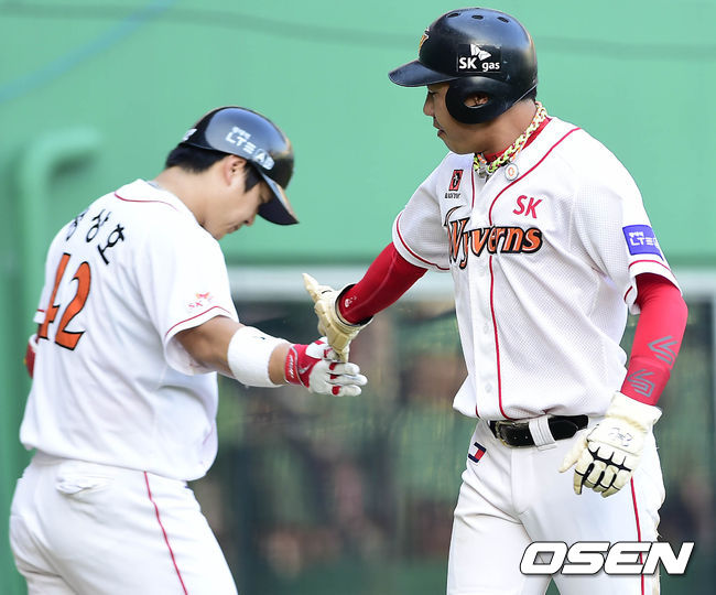 13일 오후 인천 문학구장에서 열린 '2014 한국야쿠르트 세븐 프로야구 SK 와이번스와 NC 다이노스의 경기, 2회말 1사 주자 1,3루 SK 나주환의 적시타에 홈을 밟은 3루 주자 김강민이 정상호와 기쁨을 나누고 있다.