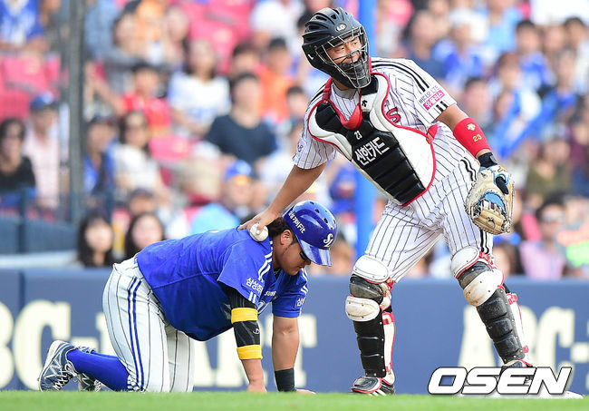 2회초 삼성 공격 무사 1, 3루 상황 박해민의 1루수 병살타 때 3루 주자 박석민이 협살에 걸려 LG 포수 최경철에게 태그아웃 당한 뒤 한번 더 태그하고 있다.