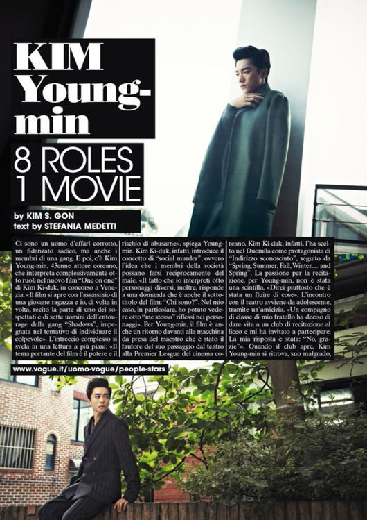 배우 김영민이 이탈리아 보그(Vogue)의 남성판 루오모(L'uomo)의 2014년 9월호 화보를 장식했다.
