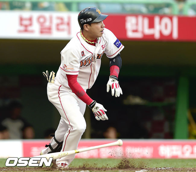 13일 오후 인천 문학구장에서 열린 '2014 한국야쿠르트 세븐 프로야구 SK 와이번스와 NC 다이노스의 경기, 3회말 무사 주자2루, SK 김강민이 2루 주자 박정권을 불러들이는 1타점 적시타를 치고 있다.