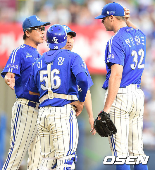4회말 LG 공격 1사 1, 3루 상황 이병규가 선제 1타점 적시 우전안타를 허용한 삼성 선발 밴덴헐크가 마운드에 오른 김태한 코치와 대화를 나누고 있다.