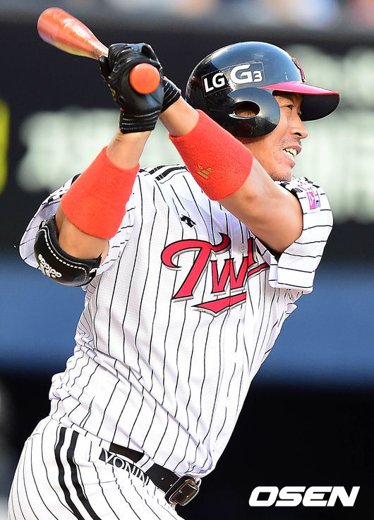 4회말 LG 공격 1사 1, 3루 상황 이병규가 선제 1타점 적시 우전안타를 날리고 있다.