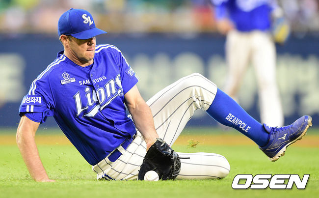 5회말 LG 공격 선두타자로 나선 박경수의 내야 안타 타구를 삼성 선발 밴덴헐크가 슬라이딩하며 잡아내고 있다. 하지만 타이밍이 늦어 타자주자 세이프.