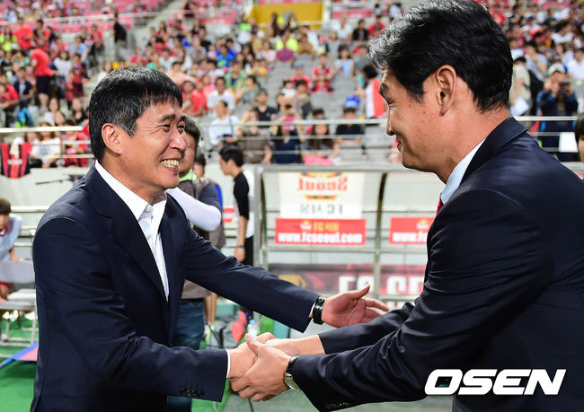 13일 오후 서울월드컵경기장에서 열린 '현대오일뱅크 K리그 클래식 2014' FC 서울과 인천 유나이티드의 경기 시작전 김봉길 감독과 최용수 감독이 악수를 나누고 있다.