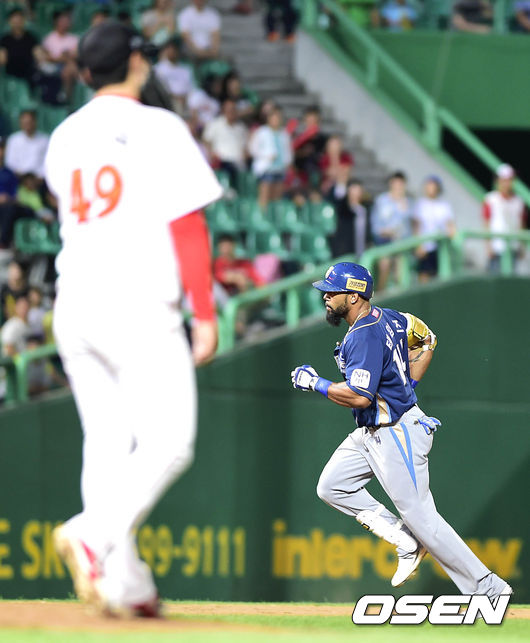 13일 오후 인천 문학구장에서 열린 '2014 한국야쿠르트 세븐 프로야구 SK 와이번스와 NC 다이노스의 경기, 6회초 무사 상황, NC 테임즈가 나성범의 홈런포에 이어 백투백 솔로 홈런을 치고 그라운드를 돌고 하고 있다.