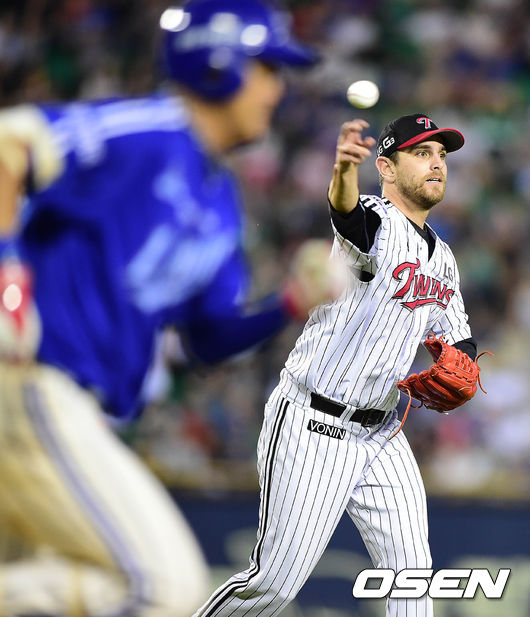 6회초 삼성 공격 1사 주자없는 상황 박한이의 투수 앞 땅볼 때 LG 선발 리오단이 타구를 잡아 1루로 공을 던지고 있다.