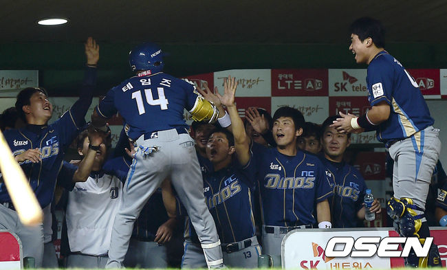 13일 오후 인천 문학구장에서 열린 '2014 한국야쿠르트 세븐 프로야구 SK 와이번스와 NC 다이노스의 경기, 6회초 NC 테임즈가 나성범의 홈런에 이어 백투백 솔로홈런을 치며 역전에 성공하고 기뻐하고 있다.