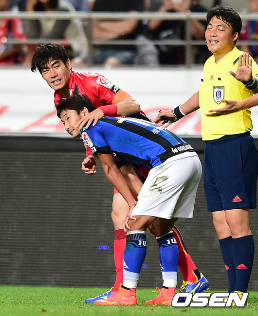 13일 오후 서울월드컵경기장에서 열린 '현대오일뱅크 K리그 클래식 2014' FC 서울과 인천 유나이티드의 경기 전반 김주영이 이천수에게 사과의 제스처를 보내고 있다.