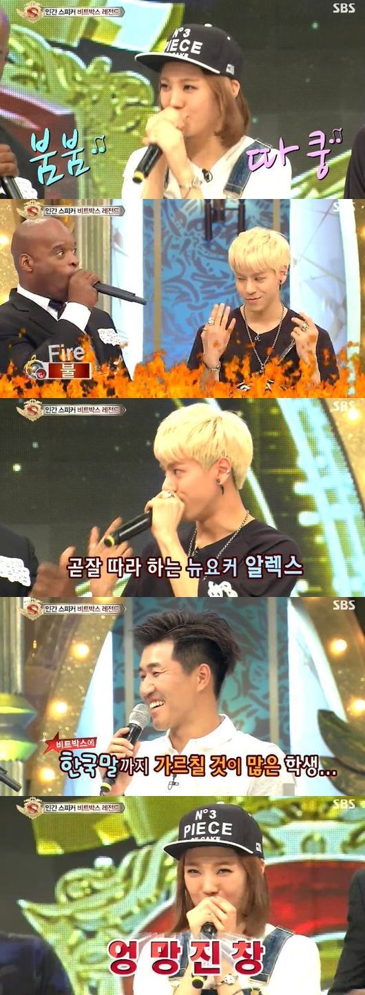 리지, 알렉스, 김종민은 13일 오후 방송된 SBS 예능프로그램 '놀라운 대회 스타킹'에서 '비트박스 레전드'인 케니 무하마드에게 비트박스를 전수받았다.