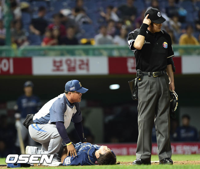 13일 오후 인천 문학구장에서 열린 '2014 한국야쿠르트 세븐 프로야구 SK 와이번스와 NC 다이노스의 경기, 7회초 1사 주자 없는 상황, SK 진해수의 공이 NC 나성범의 머리로 날아와 쓰러져 있다. 심판이 진해수에게 퇴장을 지시하고 있다.