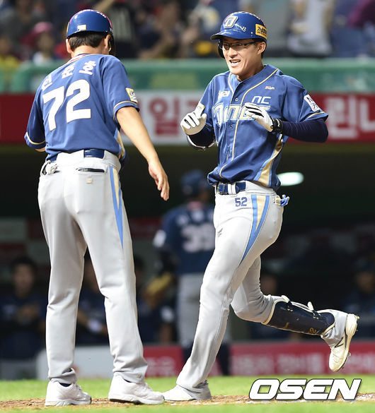 13일 오후 인천 문학구장에서 열린 '2014 한국야쿠르트 세븐 프로야구 SK 와이번스와 NC 다이노스의 경기, 7회초 2사 주자 3루, NC 노진혁이 투런포를 치고 홈으로 들어오고 있다.
