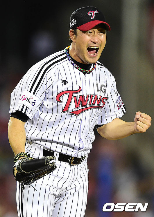 9회초 삼성 공격 2사 주자없는 상황 대타 김태완을 삼진으로 이끌며 경기를 마무리지은 LG 투수 봉중근이 포효하고 있다./dreamer@osen.co.kr