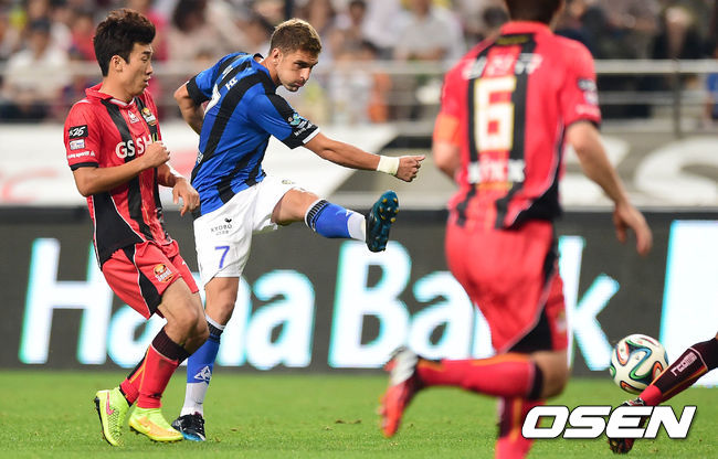 13일 오후 서울월드컵경기장에서 열린 '현대오일뱅크 K리그 클래식 2014' FC 서울과 인천 유나이티드의 경기 후반 이보가 슛을 시도하고 있다.