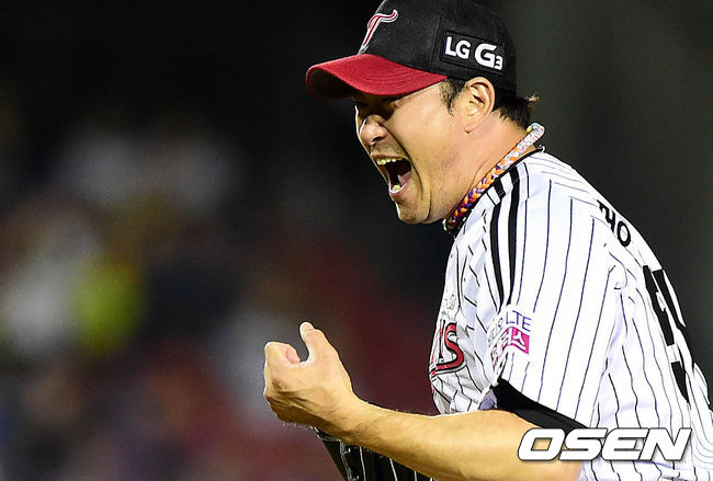 9회초 삼성 공격 2사 주자없는 상황 대타 김태완을 삼진으로 이끌며 경기를 마무리지은 LG 투수 봉중근이 포효하고 있다./dreamer@osen.co.kr