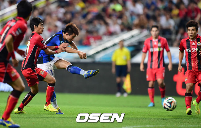 13일 오후 서울월드컵경기장에서 열린 '현대오일뱅크 K리그 클래식 2014' FC 서울과 인천 유나이티드의 경기 후반 김도혁이 슈팅을 시도하고 있다.