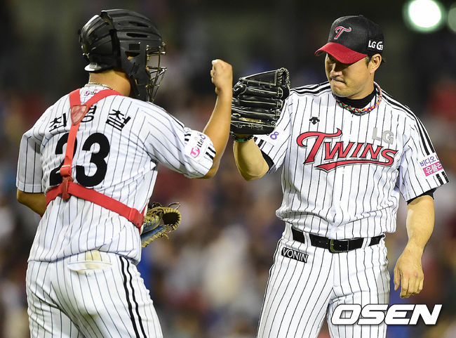 9회초 삼성 공격 2사 주자없는 상황 대타 김태완을 삼진으로 이끌며 경기를 마무리지은 LG 투수 봉중근과 포수 최경철이 인사를 나누고 있다./dreamer@osen.co.kr