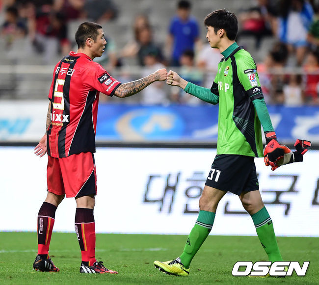 13일 오후 서울월드컵경기장에서 열린 '현대오일뱅크 K리그 클래식 2014' FC 서울과 인천 유나이티드의 경기 종료 후 차두리와 유상훈이 하이파이브를 하고 있다.