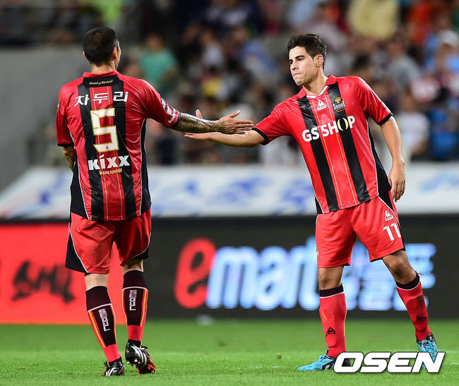 13일 오후 서울월드컵경기장에서 열린 '현대오일뱅크 K리그 클래식 2014' FC 서울과 인천 유나이티드의 경기 종료 후 차두리와 몰리나가 하이파이브를 하고 있다.