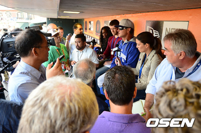 14일(이하 한국시간) 미국 캘리포니아주 샌프란시스코 AT&T 파크에서 열린 '2014 메이저리그' LA 다저스와 샌프란시스코 자이언츠의 경기, 경기에 앞서 다저스 매팅리 감독이 더그아웃에서 취재진과 이야기를 나누고 있다.