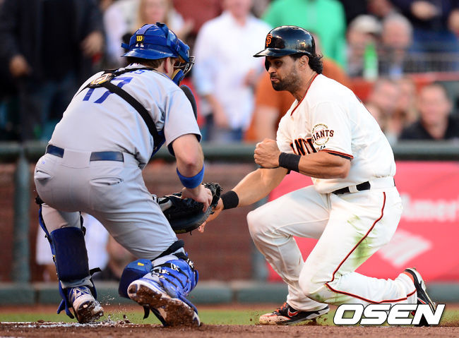 14일(이하 한국시간) 미국 캘리포니아주 샌프란시스코 AT&T 파크에서 열린 '2014 메이저리그' LA 다저스와 샌프란시스코 자이언츠의 경기, 1회말 1사 2루에서 샌프란시스코 포지가 우전 안타를 날렸지만 1루주자 파건이 홈에서 다저스 엘리스에 태그아웃 당하고 있다.