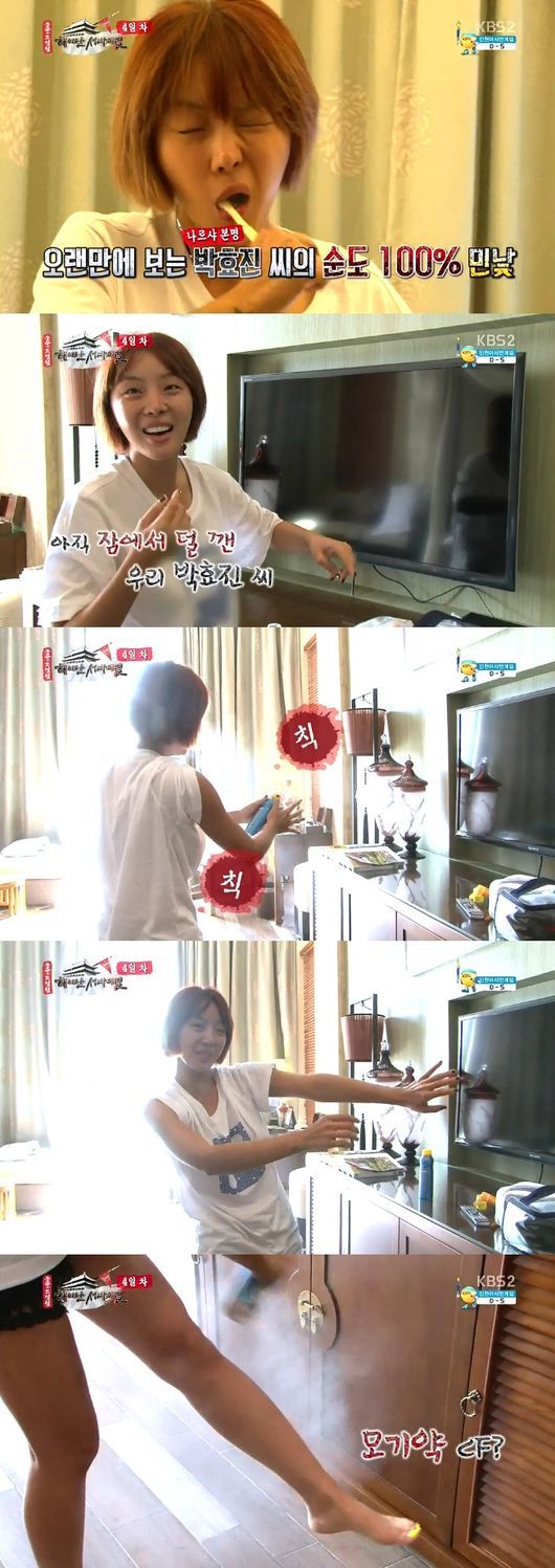 14일 오전 방송된 KBS 2TV '출발드림팀2'의 ‘중국 하이난 서바이벌 제4탄 : 살신성인’에서는 아침에 일어나 씻는 나르샤의 모습이 전파를 탔다.