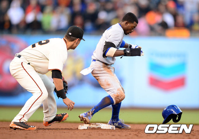 14일(이하 한국시간) 미국 캘리포니아주 샌프란시스코 AT&T 파크에서 열린 '2014 메이저리그' LA 다저스와 샌프란시스코 자이언츠의 경기, 3회초 1사 1루에서 다저스 고든이 2루 도루에 성공하고 있다. 고든은 시즌 60 도루 성공.