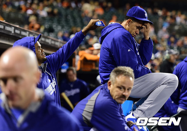 9회초 다저스 잰슨이 프리아스에 장난을 치고 있다. /jpnews@osen.co.kr