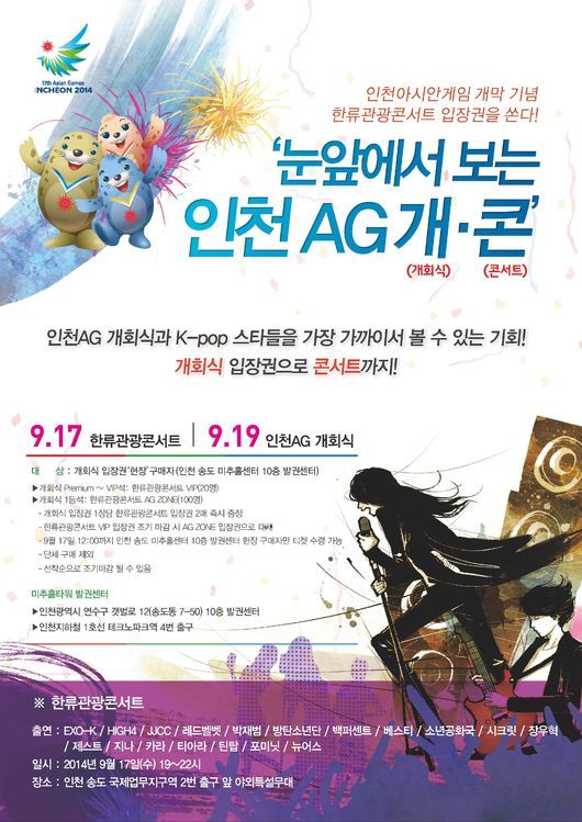 2014인천아시아경기대회 조직위원회(위원장 김영수)는 송도 미추홀타워 10층 조직위 발권센터에서 1등석 이상 개회식 입장권을 현장 구매하는 고객을 대상으로 대회 전야제 행사인 ‘2014인천한류관광콘서트’ 초대권을 증정한다.