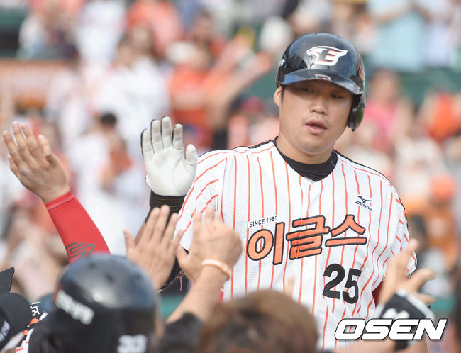 14일 오후 대전야구장에서 열린 '2014 한국야쿠르트 세븐 프로야구' 한화 이글스와 KIA 타이거즈의 경기, 6회말 선두타자 최진행 중월솔로 홈런을 날리고 홈인 동료들의 축하를 받고 있다.