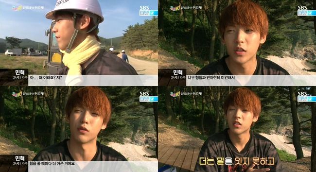 하지만 너무 무리한 탓, 민혁은 가슴을 부여잡으며 고통을 호소했다. 이에 김병만은 그늘에 가서 쉬기를 권했으며 민혁은 "형들하고 민아한테 너무 미안해서 도와드리려고 했는데 힘을 줄 때마다 아프다"라며 고개를 푹 숙여 시선을 모았다.