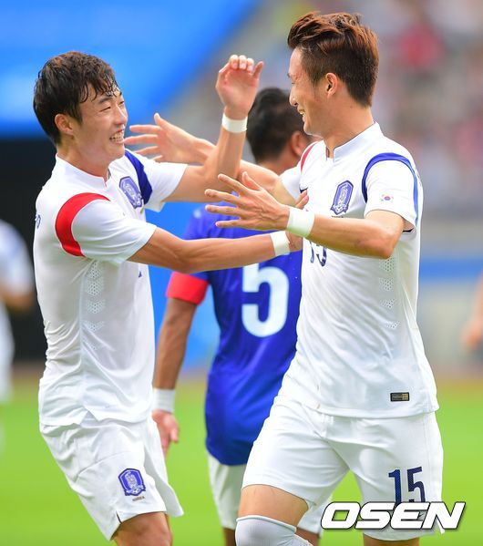 14일 오후 인천 문학경기장에서 열린 2014 인천 아시안게임 남자 축구 A조 조별리그 1차전 한국과 말레이시아의 경기 임창우가 선취골을 넣고 환호하고 있다